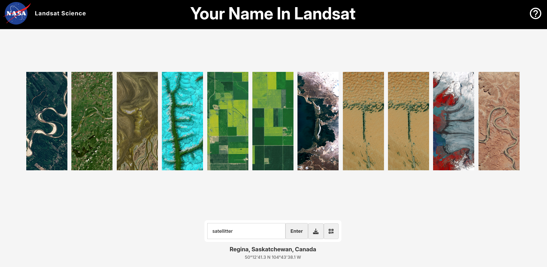 Teksten over ble produsert ved hjelp av et verktøy laget av NASA. De har tagget ulike områder på jorden som minner om bokstaver i det engelske alfabetet (a-z). Du skriver inn et ord eller bokstaver og den lager bilder som over.