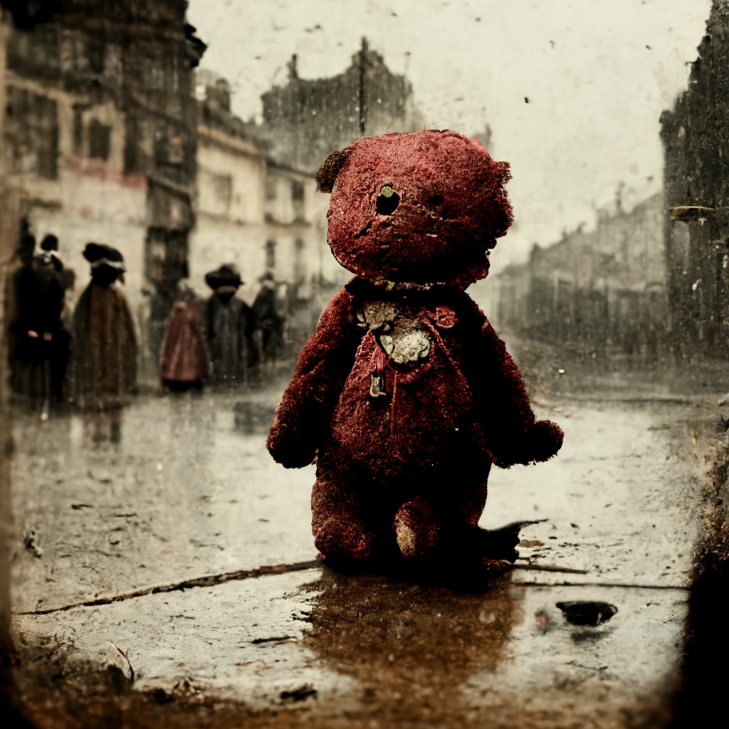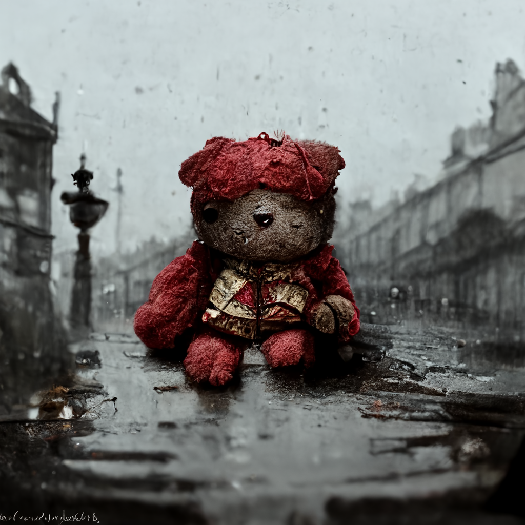 a forgotten red teddy bear lying of the street a rainy day in a 1800s victorian city
