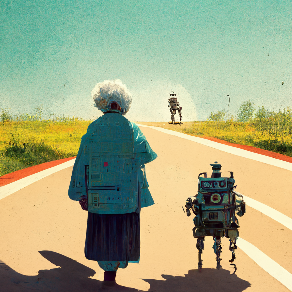 a robot helping an old woman cross a road a sunny day
