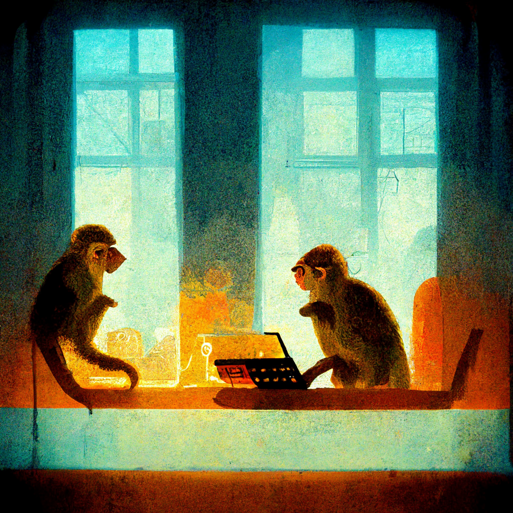 monkeys typing on an old computer in a room, a sunny autumn day outside