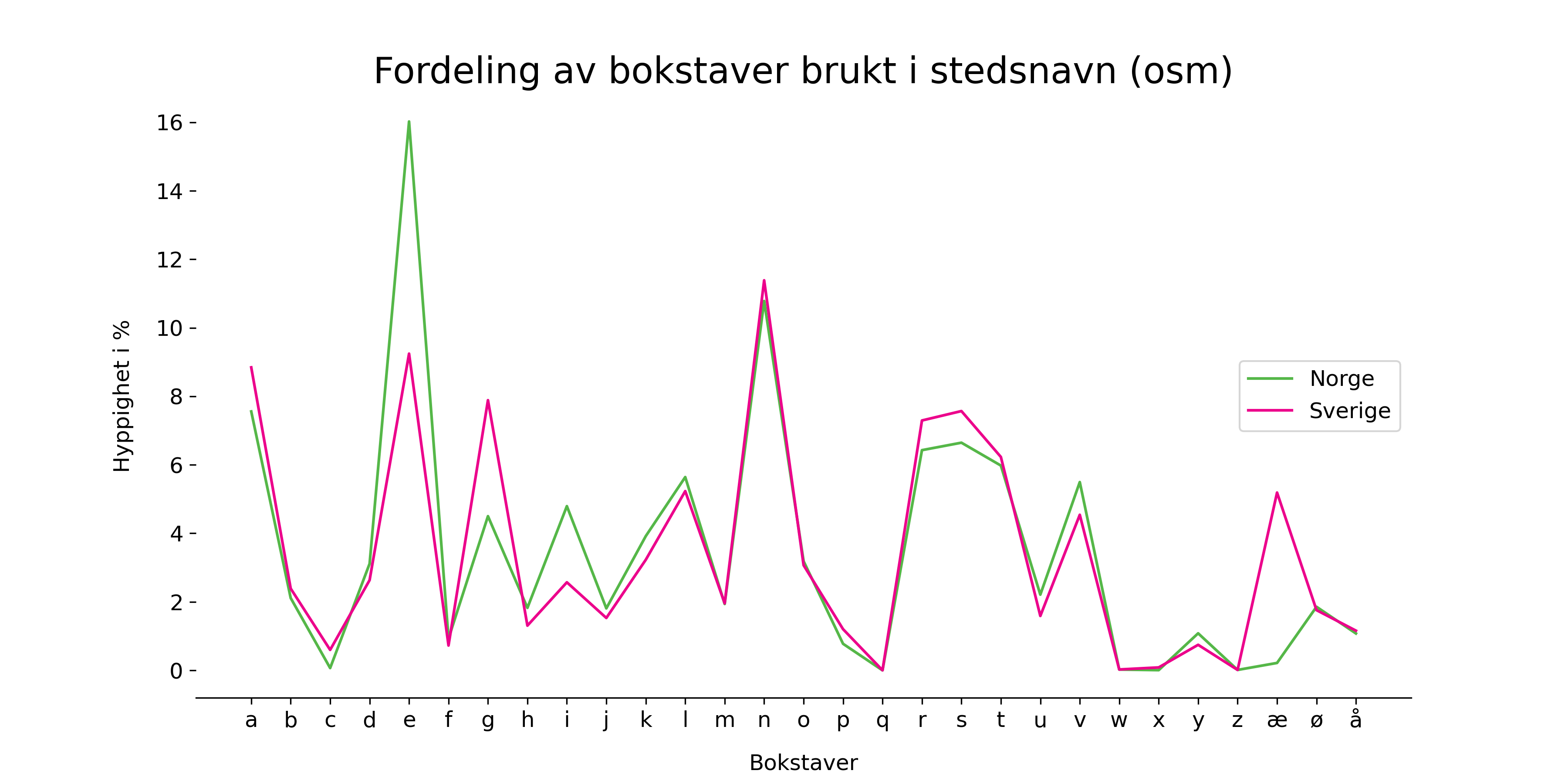 - Hva om jeg ser på samtlige stedsnavn og teller opp antall ganger ulike bokstaver brukes.