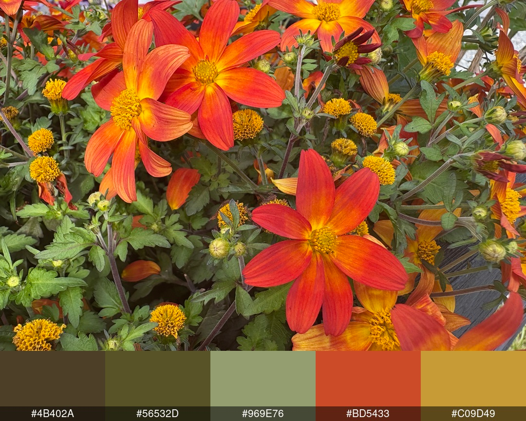 KodeBeskrivelse (Gemini)#4B402AEn mørk, dyp brun med en antydning av oliven eller mørk jordfarge.#56532DEn dempet, mørk oliven-grønn. Minner om tørket løvverk eller skyggelagt grønt.#969E76En lysere, mer dempet grønnfarge med en grålig eller beige undertone. Kan minne om visse typer salviegrønn.#BD5433En levende, mettet oransjerød farge. Dette er hovedfargen på blomstene og minner om en brent oransje eller terrakotta.#C09D49En gyllen, sennep-gul farge. Denne representerer de gule sentrene og noen av de lysere blomstene i bildet.