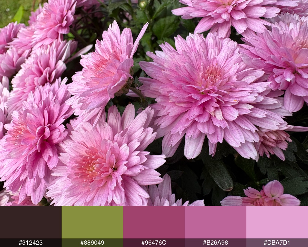 KodeBeskrivelse (Gemini)#312423En veldig mørk brun, nesten svart, med en svak rødlig undertone. Kan minne om mørk sjokolade eller jord.#889049En dempet, oliven-aktig grønn farge. Den har en jordnær og litt gråaktig tone, typisk for løvverk i visse lysforhold.#96476CEn dyp, mettet rosafarge med lilla undertoner. Dette er en rik og varm nyanse som passer godt til blomstene i bildet.#B26A98En lysere, men fortsatt mettet, rosa-lilla farge. Den er litt mer pastellaktig enn den forrige, men beholder en fin dybde.#DBA7D1En veldig lys og myk rosa-lilla farge. Denne er nærmest en pastellfarge og gir en lys og delikat følelse, og representerer sannsynligvis de lyseste områdene på kronbladene.