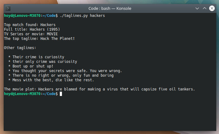 That’s why I wrote this simple little script to to to IMDb for me and return with only the taglines: