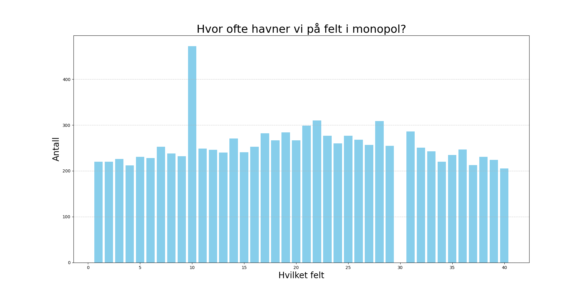 De 40 feltene har jeg telt fra Parkveien som felt 1 og Start som felt 40. Programmet holder styr på posisjonen underveis i simuleringen og hver gang et felt landes på telles det opp +1. Når simuleringen ble ferdig etter 1-2 sekunder, tegner programmet det opp som et diagram: