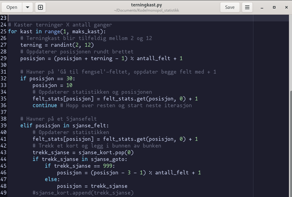 Noen regler i spillet er litt åpenbare, for eksempel at en blir sendt til fengsel fra et bestemt felt og fengelset kan også besøkes. Det er også noen sjanse- og prøv-lykkenkort som sender deg til bestemte felt. Dette må jo påvirke statistikken og jeg må ha det med i beregningen. Men det er fortsatt tilfeldige kast av to terninger som gjør alt usikkert. Hvis jeg skulle forsøke å simulere en mengde terningkast, må jeg sette opp et program som tar høyde for ulike tilfeller og forenklinger. Hva med store talls lov, hvordan vil det innvirke? Hvor mange ganger er det lurt å kjøre simuleringen? Hva med trekkbunkene når de er oppbrukt, skal de bare snus eller stokkes på nytt?