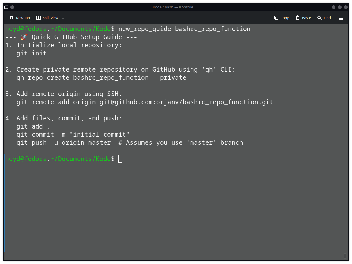 My specific use case when I needed this was to set up a GitHub from the terminal without having to use the browser to log into github.com, create the repository and then proceed from the command line. I installed the gh cli command from GitHub and have my SSH key already installed as one of the keys in my GitHub account. The function even check out my username an takes in the folder or repo name that I want to add as a new repository and dynamically prints out the commands I need, ready to be copied or written as stated.