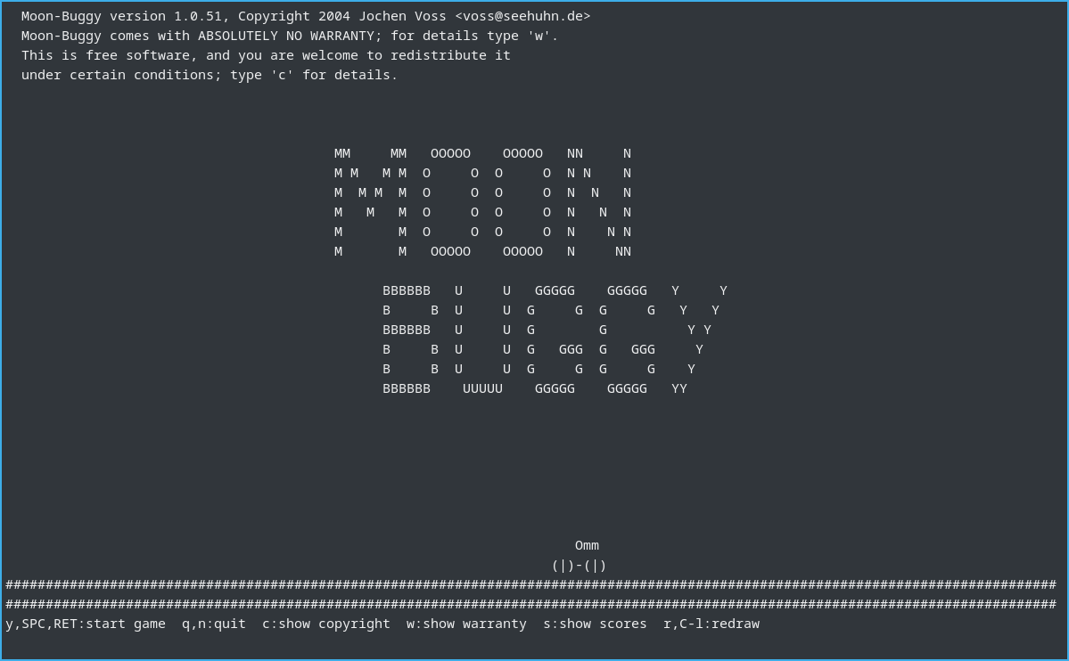 Not that many games on the command line are there? Well, here is one for you, moon-buggy. I could have included a fancy cover art, like commodore games in 80s and computer games in the 90s had a very graphical cover and then the game itself hadn’t that impressive graphics. Command line games are also very limited anyway, so I just made a screenshot.