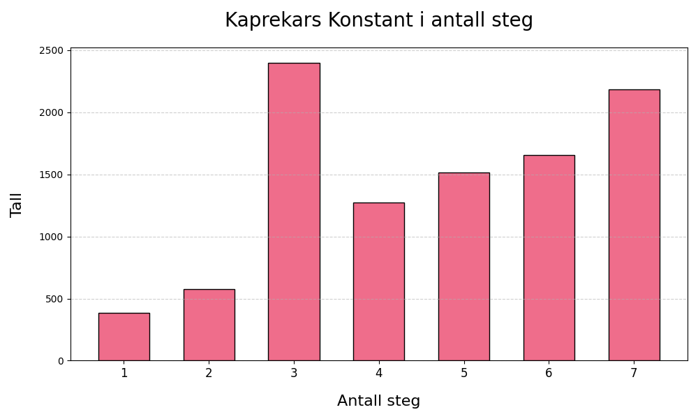 We have arrived at Kaprekar’s constant: 6174 after 3 steps. This is fine. If I do this for all possible four-digit numbers, with at least two different digits, the distribution of the number of steps required before 6174 is reached is as follows: