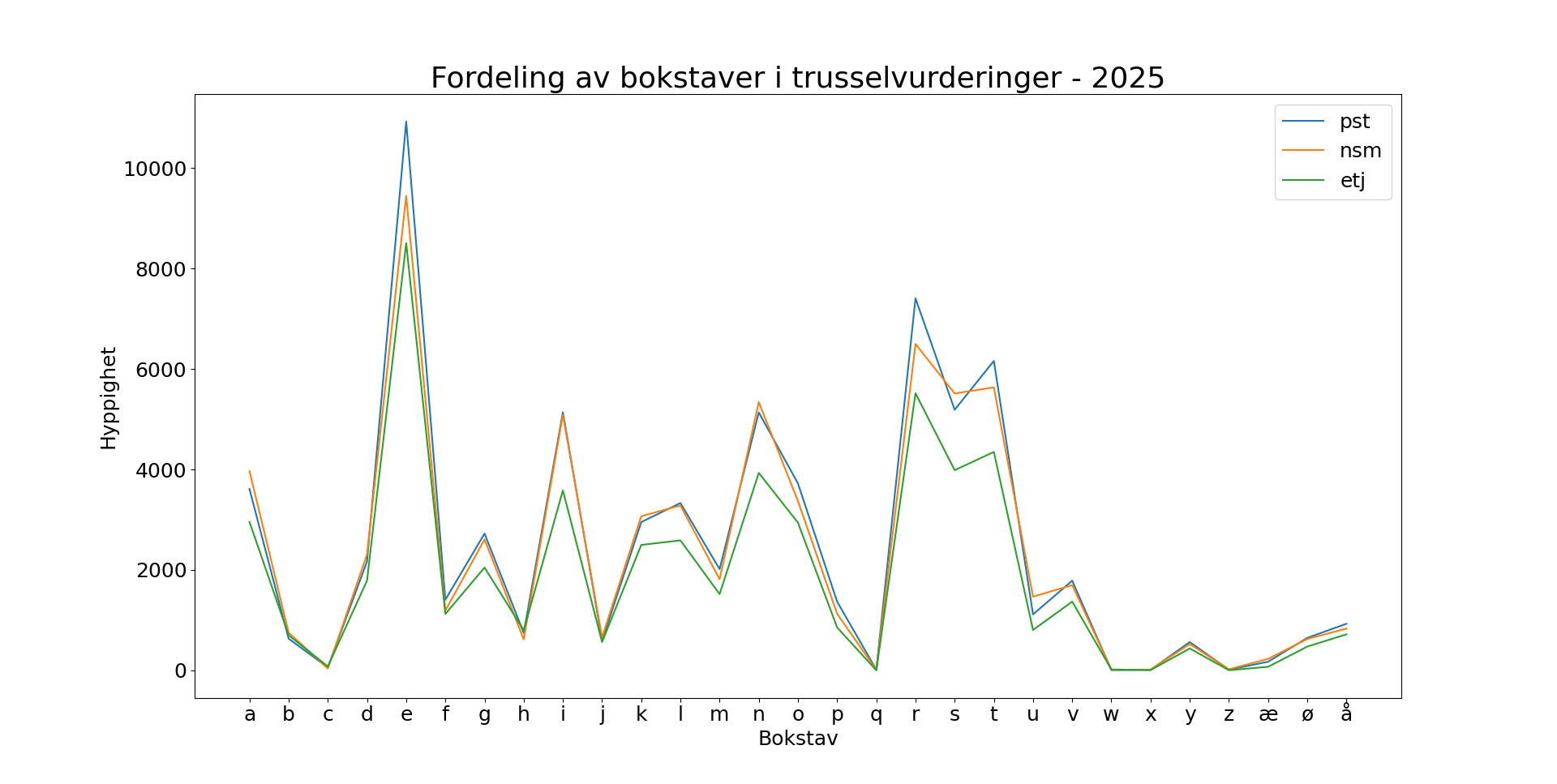 I fjor så jeg litt nærmere på hvordan trusselvurderingene til Politiets sikkerhetstjeneste (PST), Etteretningstjenesten (E-tjenesten), Nasjonal sikkerhetsmyndighet (NSM) og Politiet er satt sammen, fordelingen av ord og bokstaver. Det ble en post som du kan lese her.
