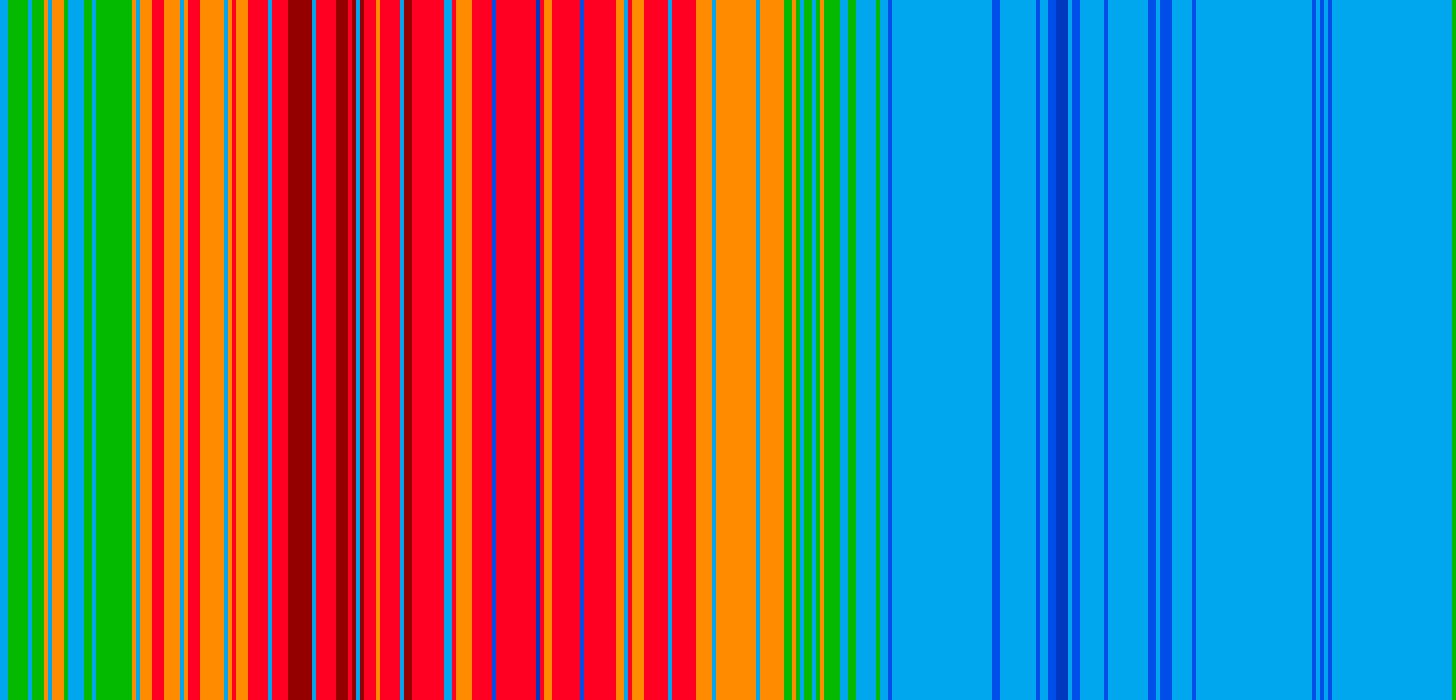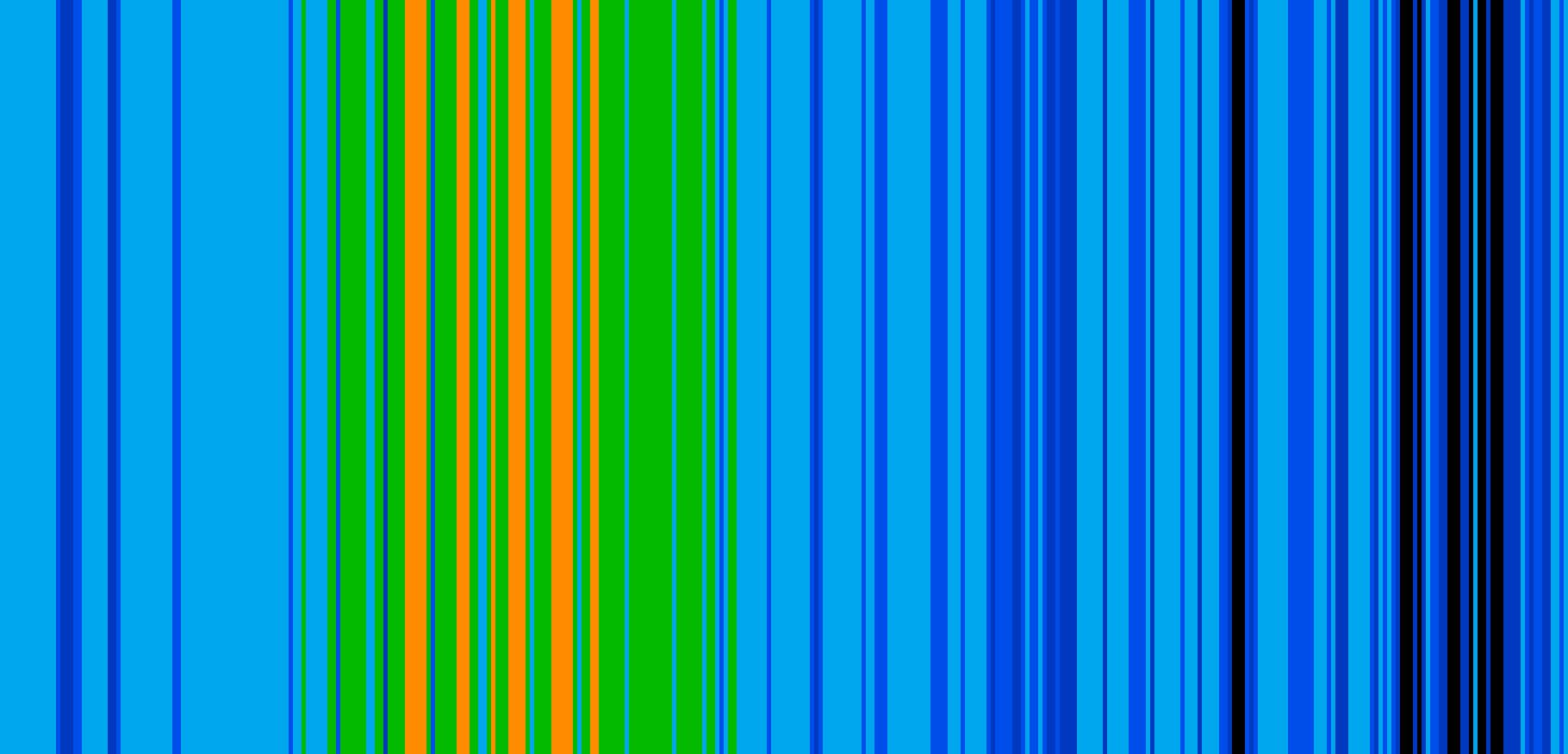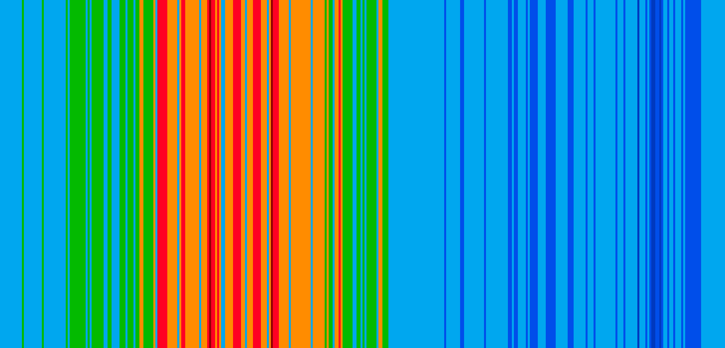 Temperaturdata fra bestemte værstasjoner kan lastes ned fra offentlige databaser gjennom såkalt APIer. Mitt lille dataprogram lager en fargestripe for hver dag hvor hver tynnestripe representerer gjennomsnittstemperaturen den dagen. Bildene settes ved siden av hverandre til en kollasj. Her er Tromsø og Andenes for året 2023: