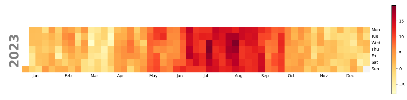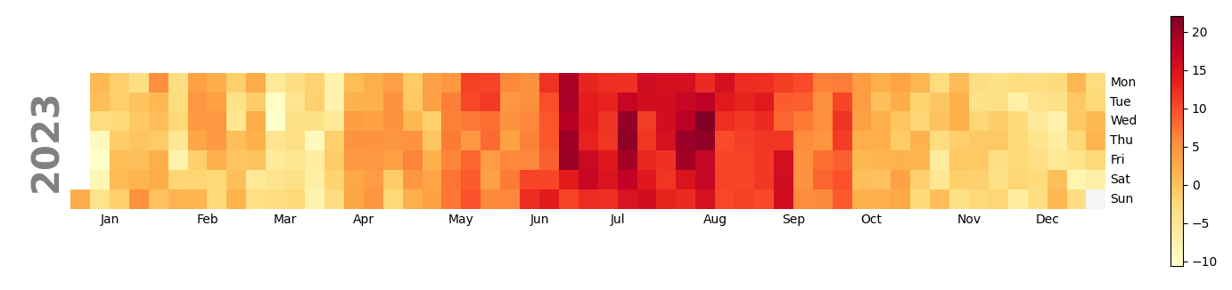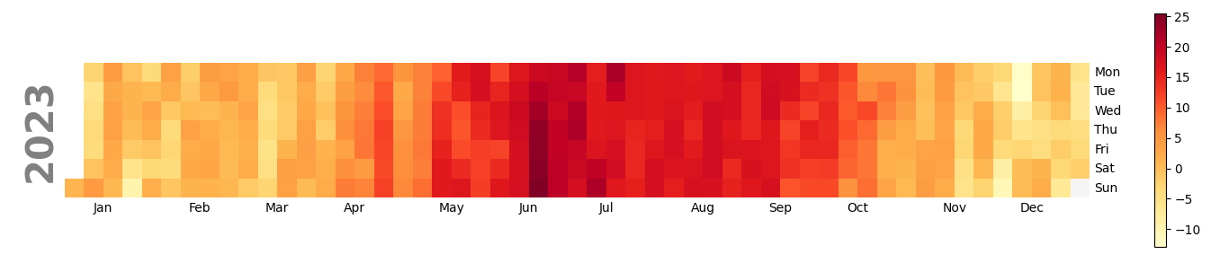En annen måte å visualisere daglige gjennomsnittstemperaturer i ett år er heatmaps. Her er slike plot for Tromsø, Andenes og Oslo i 2023:
