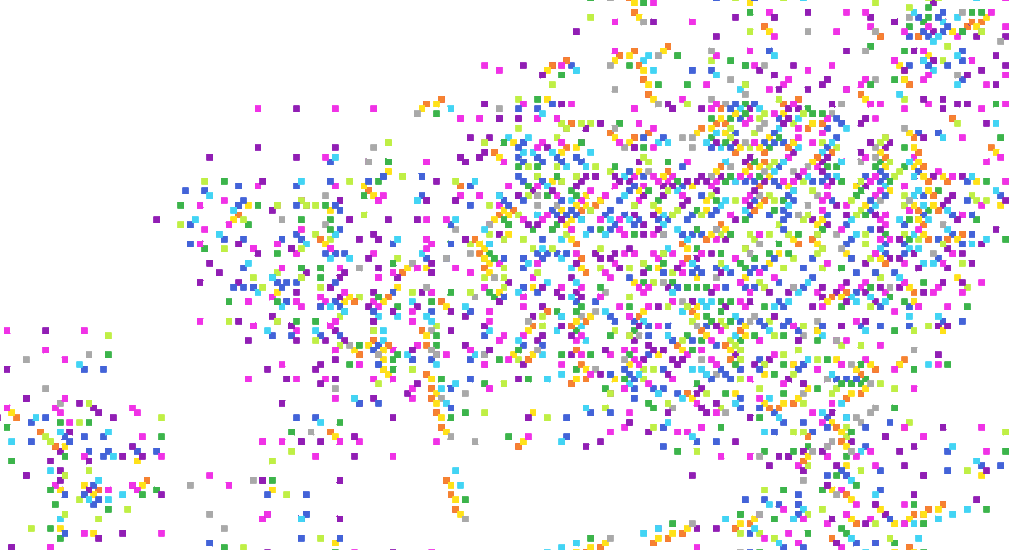 Jeg skrev et annet program som skulle ta for seg hvert av de 10 000 sifrene og tegne noe. Tegne noe basert på verdien i sifferet. De varierer naturlig nok bare mellom 0-9, men i en bestemt rekkefølge som vi nå vet. Programmet mitt tegner en firkant og bestemmer hvor neste firkant skal plasseres og hvilken farge den skal ha basert på verdien 0-9. Når dette er gjort lagres dette til en grafikkfil som du straks skal få se.